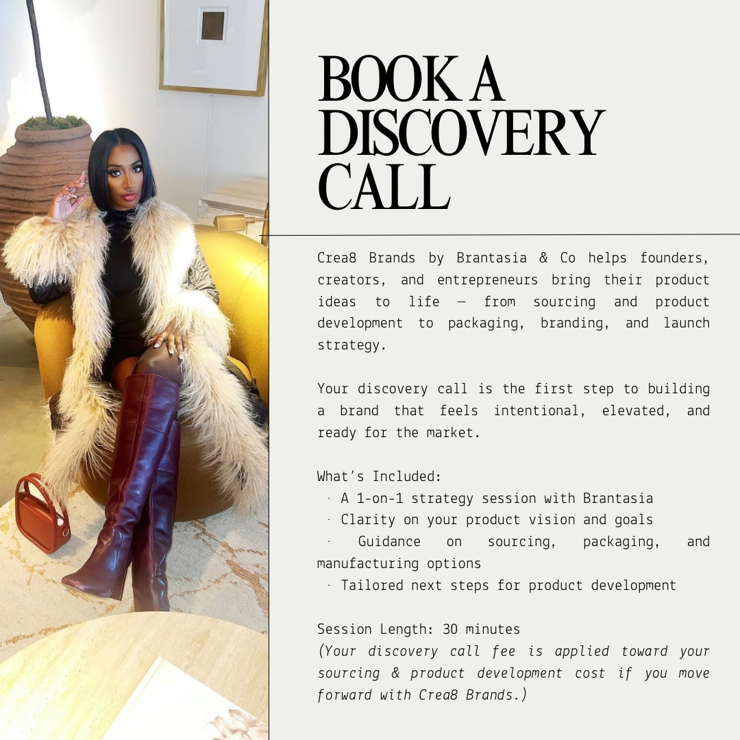 Through CREA8 BRANDS BY BRANTASIA , she helps founders and small businesses move from “idea” to “it’s ready” developing products that feel thoughtful, well-made, and built to last.